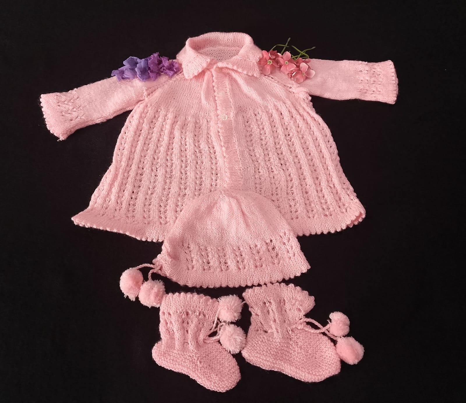 Beautifully crafted hand-knitted Baby Set for new borns,including a Baby pink frock with coordinated cap and booties